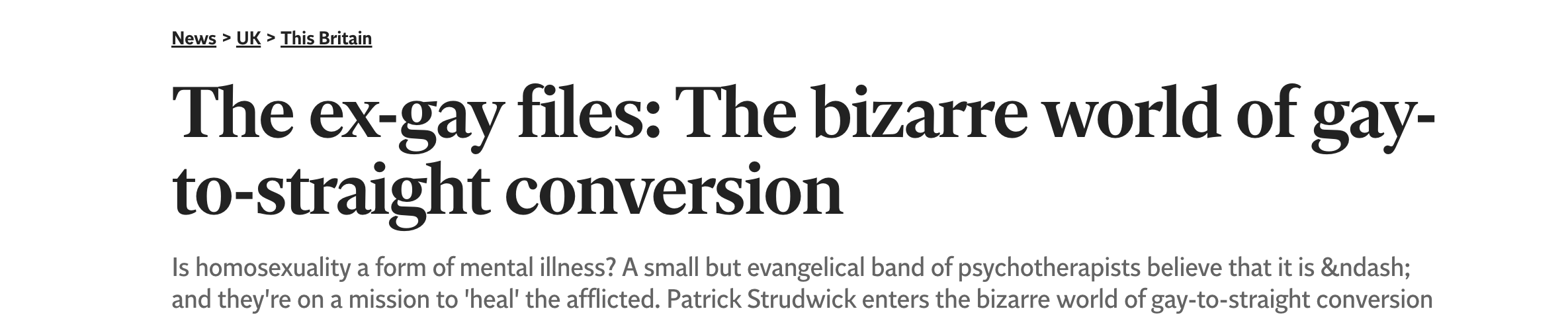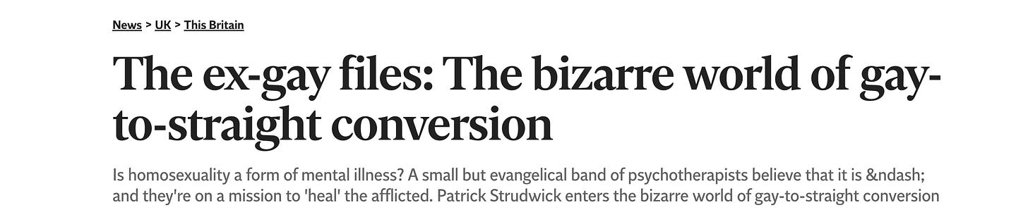Snap! The trap closes, resulting in a hostile press write-up in The Independent. The journo/’client’ makes a successful professional complaint against the counsellor. The professional association, the British Association for Counselling and Psychotherapy (BACP) issues a series of stern warnings to members not to practise ‘gay conversion therapy’.