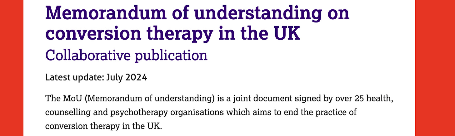 By 2015, BACP joins a host of therapy associations and employers in a policy compact, the Memorandum of Understanding on Conversion Therapy (MOU). The MOU closes its grip on most therapy, medical and psychiatric bodies in the UK. Conversion therapy is bad, not to be debated, and needs to be stamped out via a criminal legal ban.