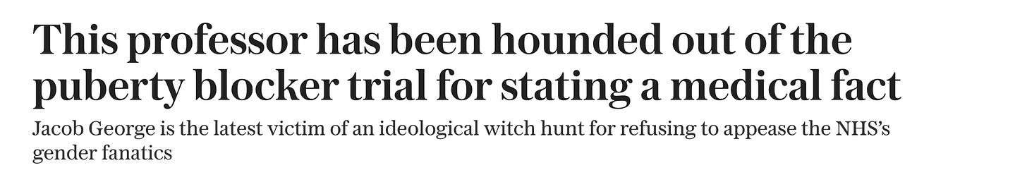 Professor Jacob George remains ‘excused’ from oversight of the paused trial. Here’s fair coverage from Adele Waters in the BMJ which wasn’t in time for last week’s roundup. Suzanne Moore had a column in the Telegraph: ‘If you don’t hold the orthodox line on gender – trans women are women, trans men are men and non-binary is valid – beware out there, especially if you work in the public sector. The clones whose cerebral cortexes have been removed in exchange for a badge, a flag and a lanyard have had their brains filled with pink and blue candyfloss.’ and Helen Joyce of Sex Matters wrote about puberty blockers on her Substack here: Making Eunuchs.
