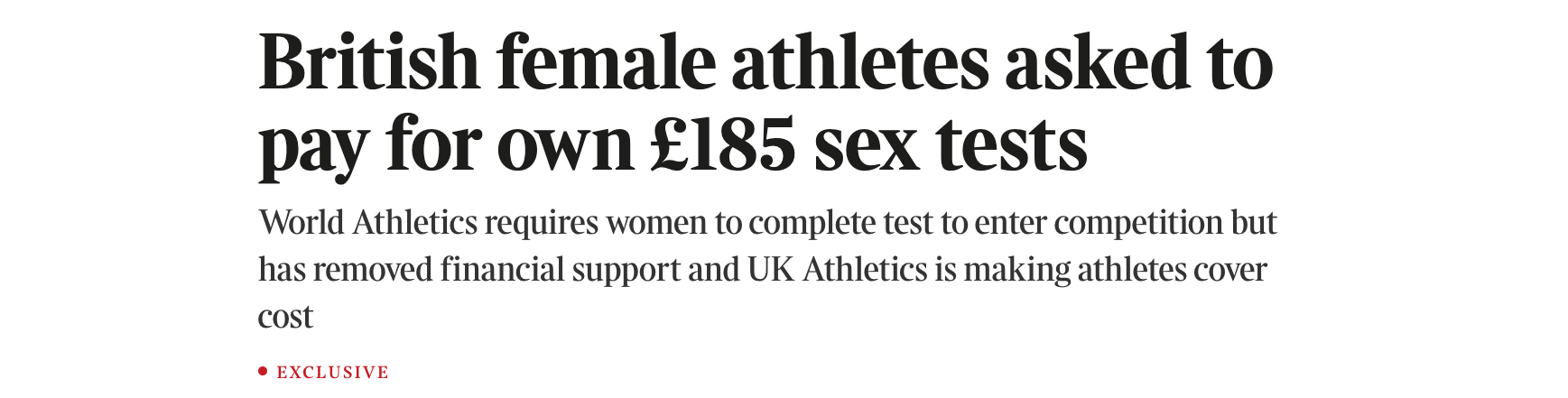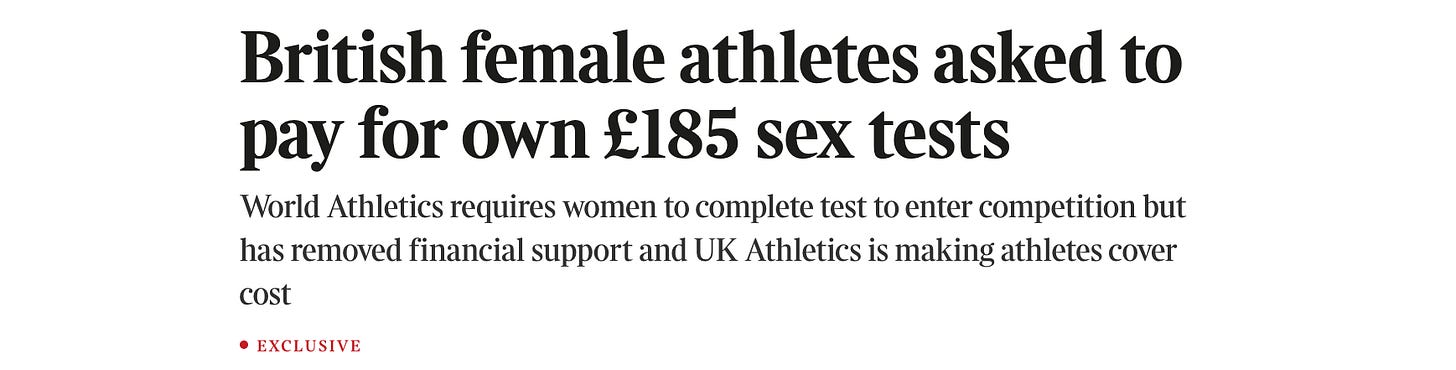 The Times reported that female athletes are, in what’s widely seen as an act of indirect discrimination, being asked to pay for their own sex tests. Great expose but it got the point of the test wrong - it’s not to exclude ‘trans and DSD athletes’, its designed to exclude males from the women’s category.