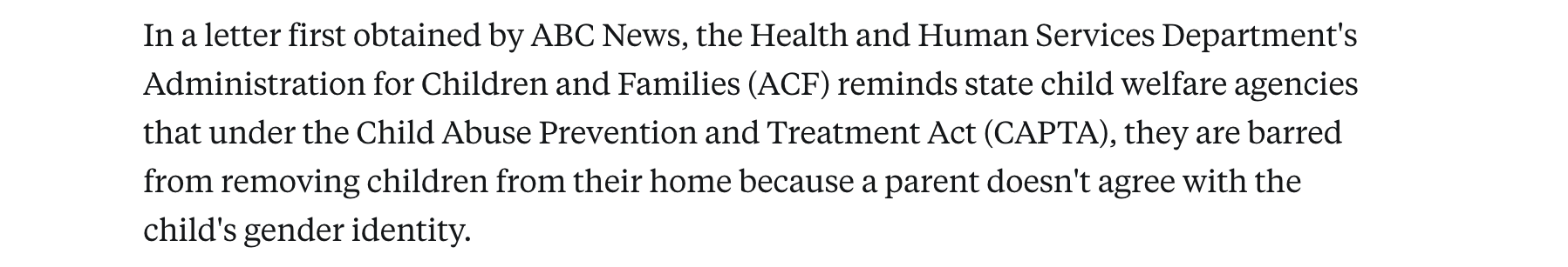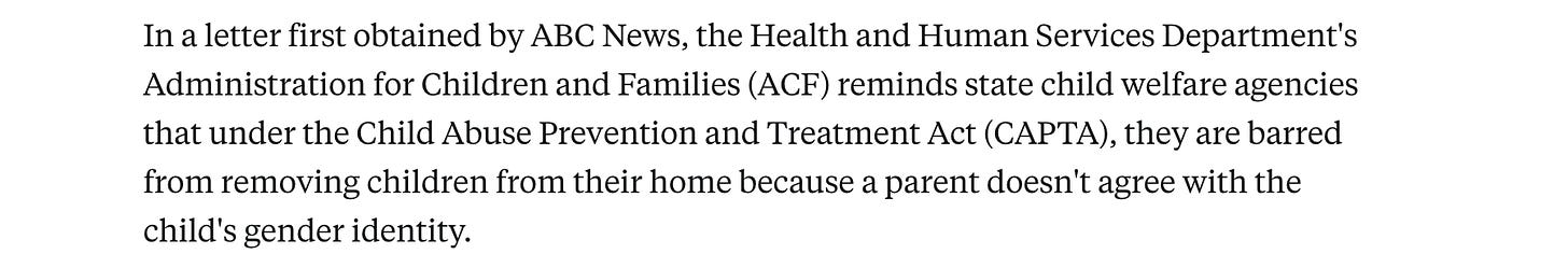 - At the same time the US government warned states about removing children from their homes when there are disputes involving trans identification