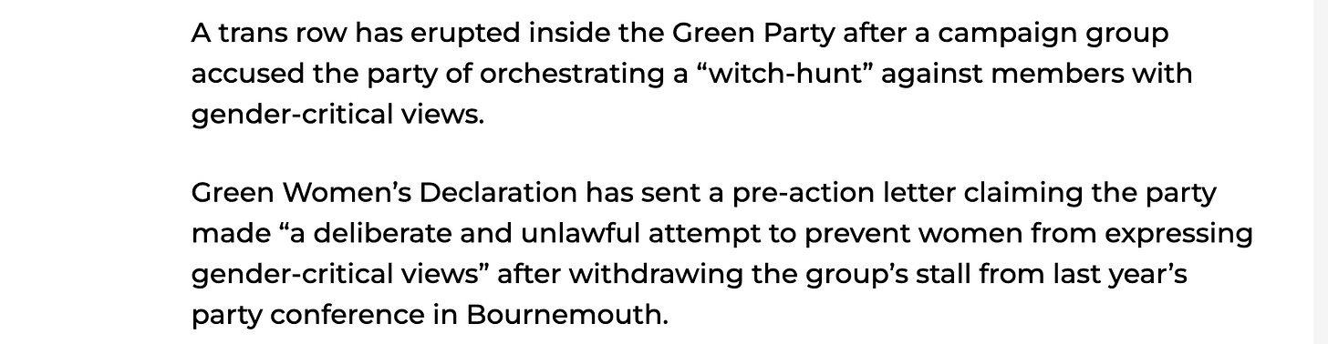 Also in the Times - this story about Green Party facing a lawsuit from gender critical women, which also made GB News. Find the women here on X.