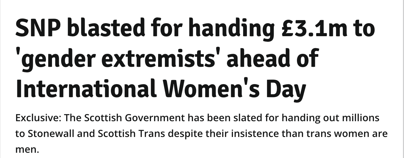 The Scottish Express has produced some great stories this week. Here’s its coverage of the excessive sums given to gender activist charities as it cuts rape support funding. As ever it’s unafraid to use accurate language. The Reach style conventions must have got lost in the post.