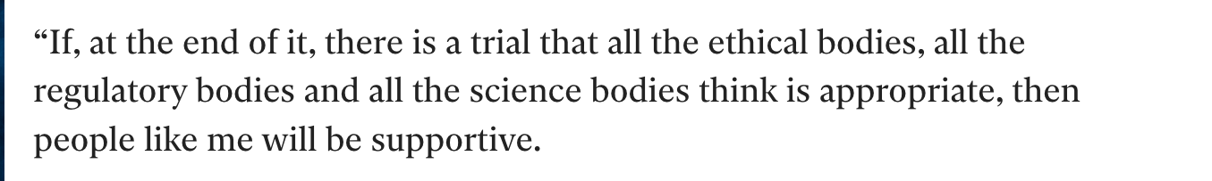 The problem is that that ethics teams, regulatory bodies and science bodies already decided that a puberty blocker trial was appropriate and have had to row back. Experts can be wrong too. He doesn’t seem to have been asked about that part.