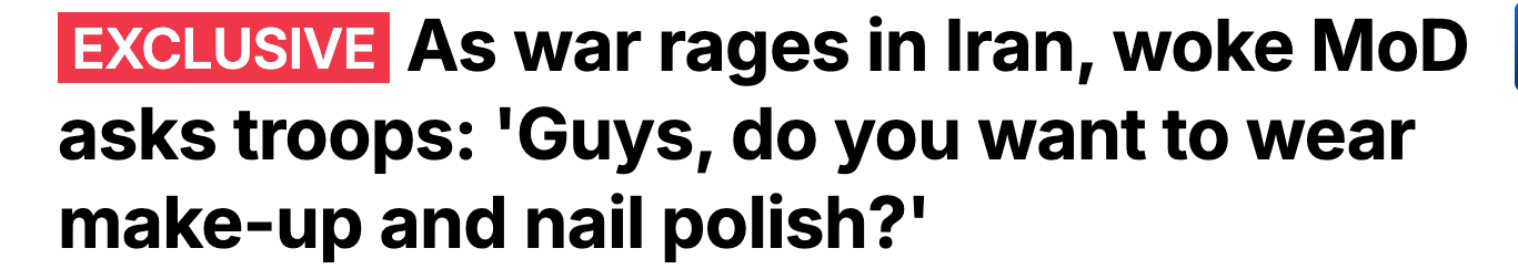 It’s as bad as it looks. ‘All serving soldiers were asked on Thursday whether they thought men could apply cosmetics and wear their hair like women. They were surveyed on ‘gender-free’ changes which could see men wearing make-up with long hair or hair extensions, painted nails and earrings’. Not the time, not the time.
