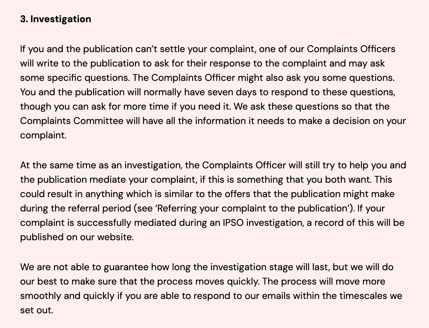 Note - even if IPSO decides there’s no possible breach of its Code, it will still send a copy of the complaint to the publication. And if there is an investigation, and your complaint is rejected, you can still appeal for it to be reviewed. That would go to an independent complaints reviewer.